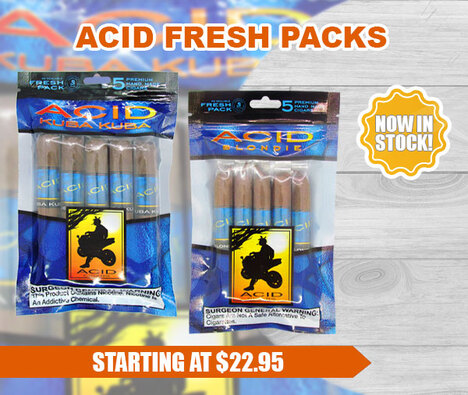 Acid Cigars presents their wildly popular Acid Blue blend, the Acid Kuba Kuba and the Acid Blondie in convenient resealable humi bags! |